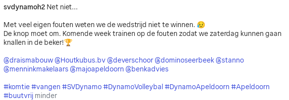 Na een zure nederlaag van vorige week tegen Inter Rijswijk was het tijd voor Dynamo. Eenmaal aangekomen bij de sporthal werden we verrast met een warming-up van 8 trappen om bij de kantine te komen. Boven aangekomen was het met de verrekijker zoeken waar we mochten spelen om vervolgens weer dezelfde trappen naar beneden te gaan om te gaan omkleden.
