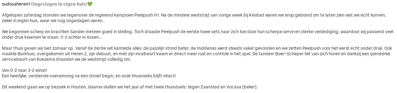 Sudosa herstelde zich van de nederlaag tegen Keistad en boekte een 3-2 zege op Peelpush na een 0-2 achterstand via 21-25, 20-25, 25-19, 25-15 en 15-10. Sudosa-trainer Erik Scholten was uiteraard blij met de winst. ,,We zijn scherp aan de wedstrijd begonnen tegen Peelpush, maar op het eind van de eerste set maken we een paar fouten, waardoor we verliezen. In de tweede set komen we niet in ons eigen spel en komen tekort ten opzichte van Peelpush. In de derde set hebben we de opstelling aangepast met Pim Boer als spelverdeler en Stean Barkhuis (talent uit Heren 2) als passer/loper. Peelpush maakt wat fouten en onze foutenlast gaat omlaag, we verdedigen ballen en het geloof komt terug, waardoor we uiteindelijk drie sets vrij eenvoudig naar ons toe halen.”