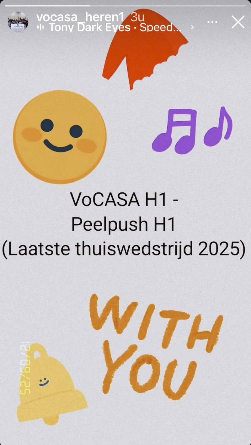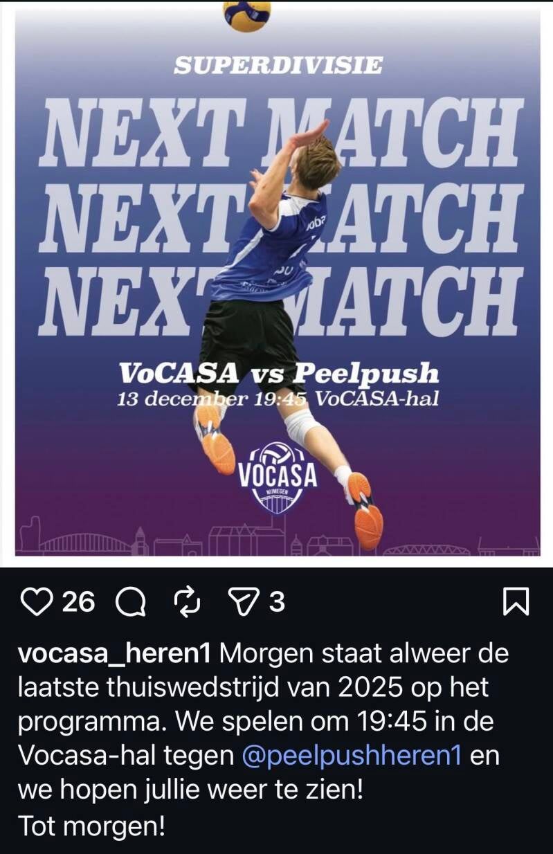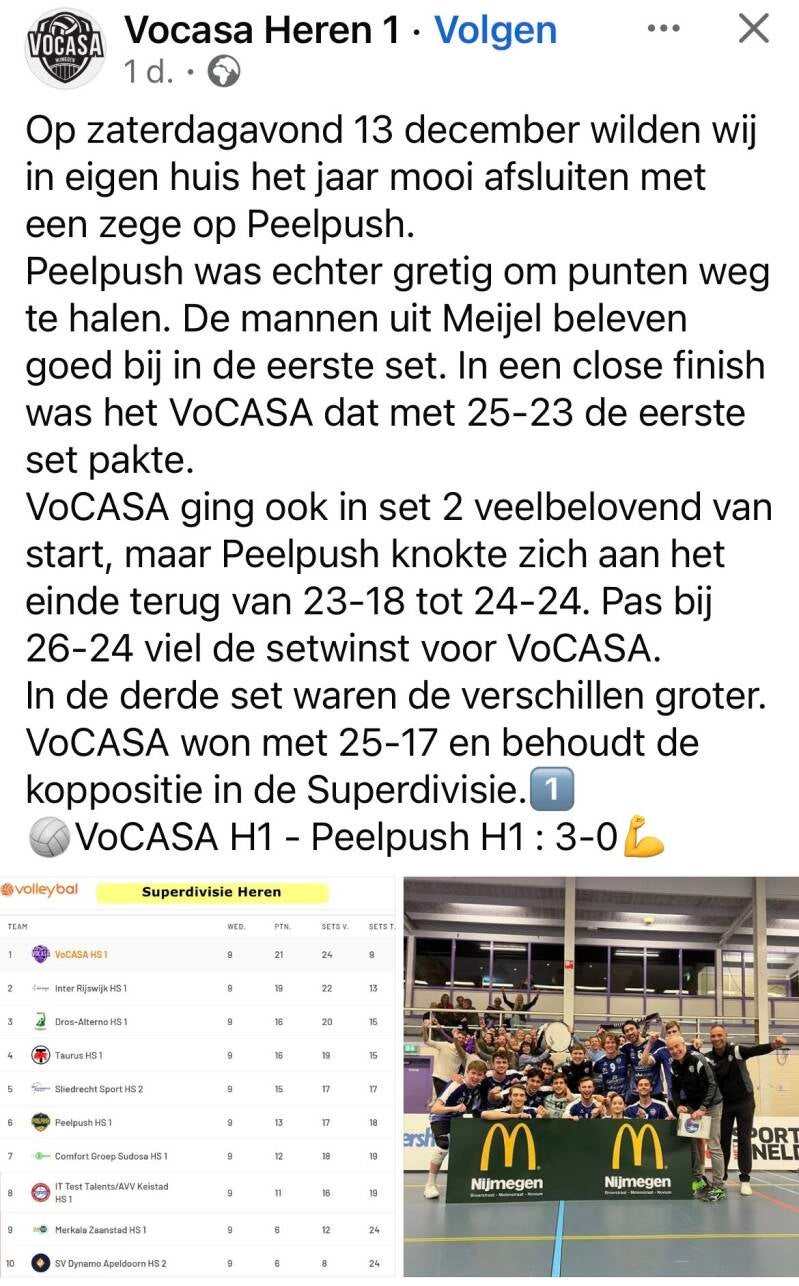 Koploper VoCASA had Peelpush te gast. Voor VoCASA was het zaak om de koppositie vast te houden en als de nummer één in de stand de stap naar volgend kalender jaar te maken op 31-12-2025. Daarin slaagden ze, al werden de eerste twee sets met 25-23 en 26-24 wel met het kleinst mogelijke verschil gewonnen. In de derde set was de koploper met 25-17 ruim beter in de score en sloot dus met 3-0 winst af. Hetgeen ook betekent dat ze als koploper het jaar 2025 uit zullen gaan.